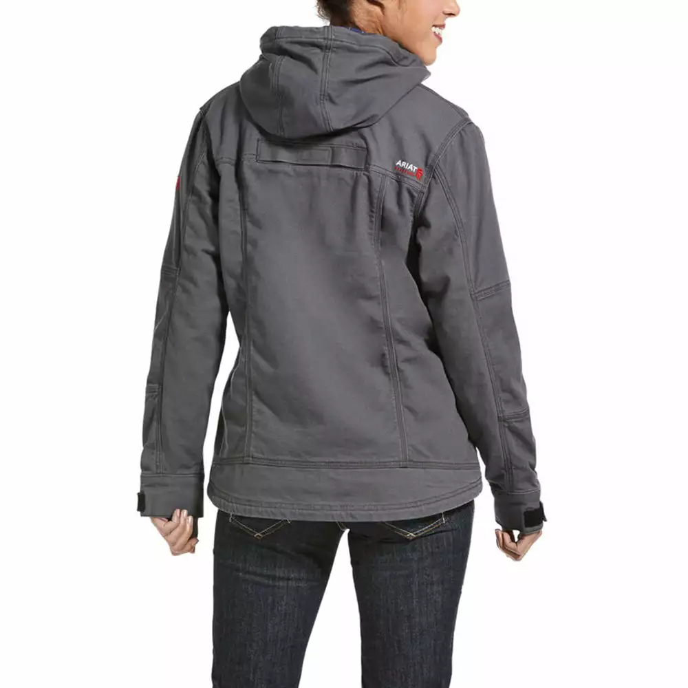 This Ariat Womens FR Duralight stretch canvas jacket provides a solid construction and polar fleece warmth while you look gorgeously good. It features DuraLight stretch canvas fabric which offers great freedom to move at work. Its flame resistant fabric is perfect for hazardous environments.