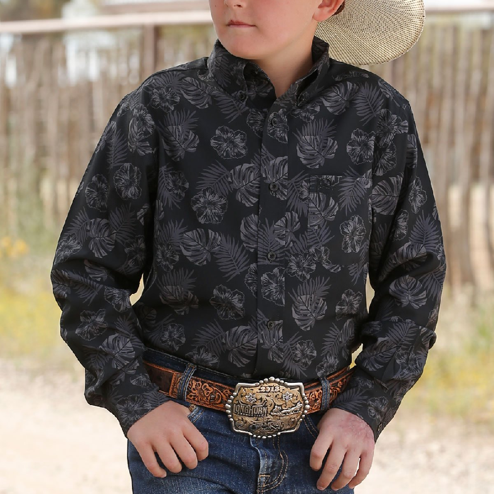 Cinch Boys Arenaflex Floral Print Shirt. Featuring extra stretch for all day comfort, this lightweight poly-spandex Arenaflex shirt belongs front and center in his closet. Design details include a handsome black print, open left front pocket, embroidered logo and black buttons.