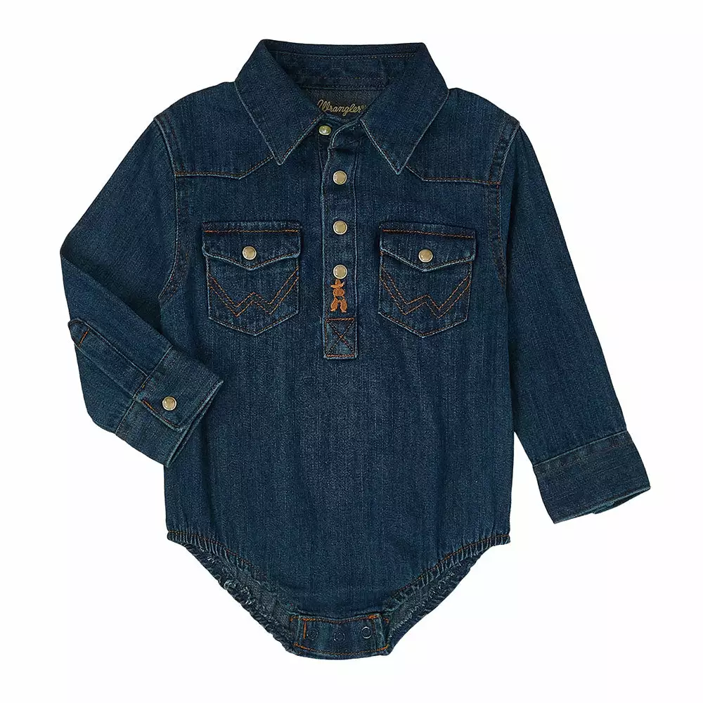 Cute Western bodysuit for your baby cowboy! This long sleeve denim bodysuit has a traditional Western styling and is made of 100% cotton denim.